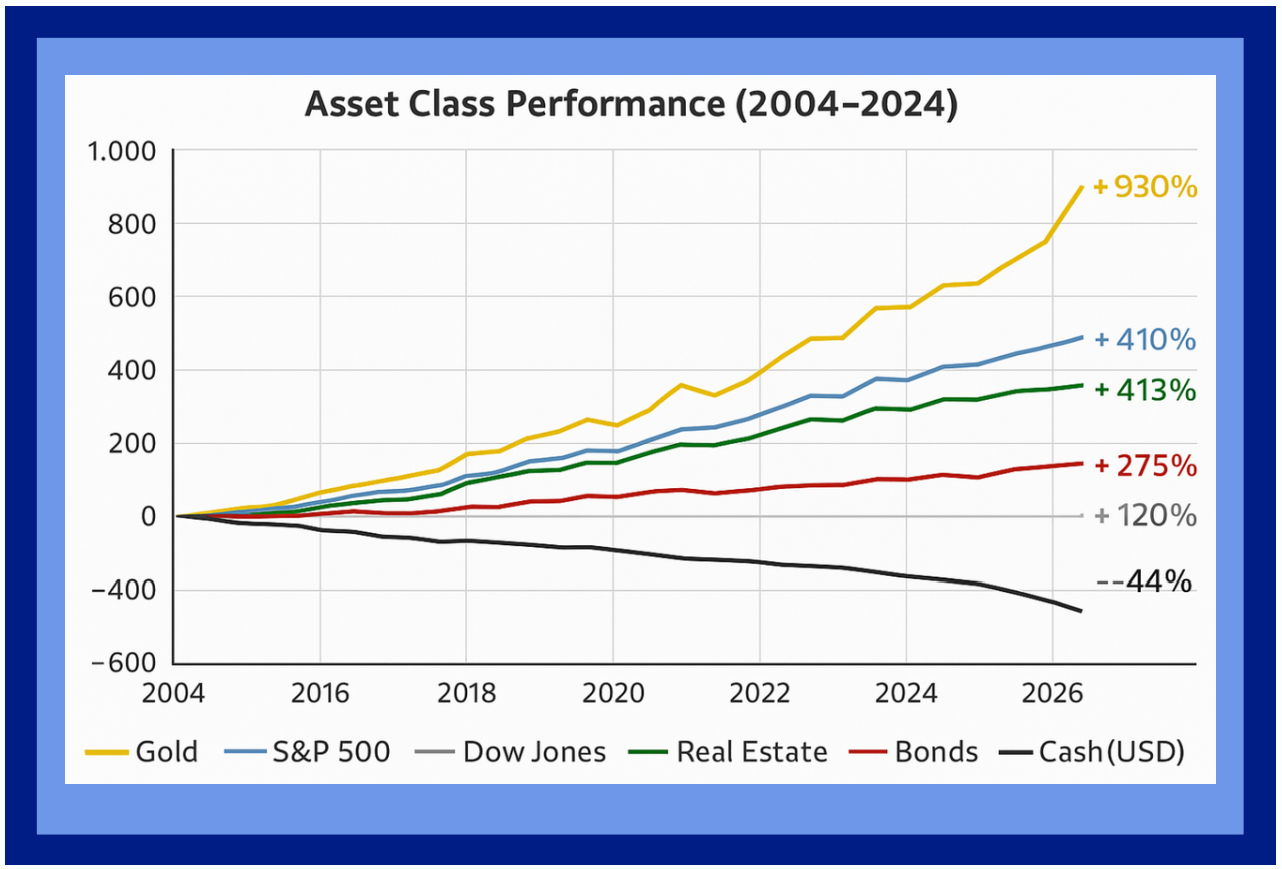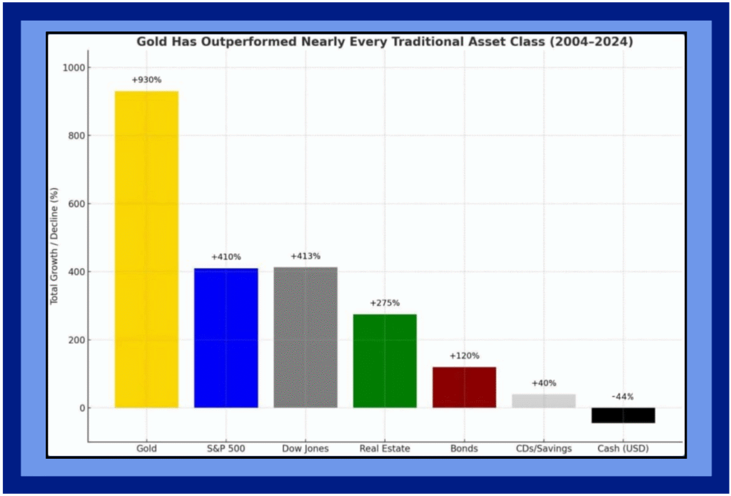 Over the last two decades, Gold has consistently outperformed traditional asset classes like real estate, bonds, and cash. While real estate can be cyclical and bonds are constrained by interest rates, gold has shown its strength as a true store of value. Cash, eroded by inflation, struggles to keep up with long-term purchasing power, while bonds offer limited upside. Gold, however, thrives in uncertain times and serves as a proven hedge against inflation, currency devaluation, and market